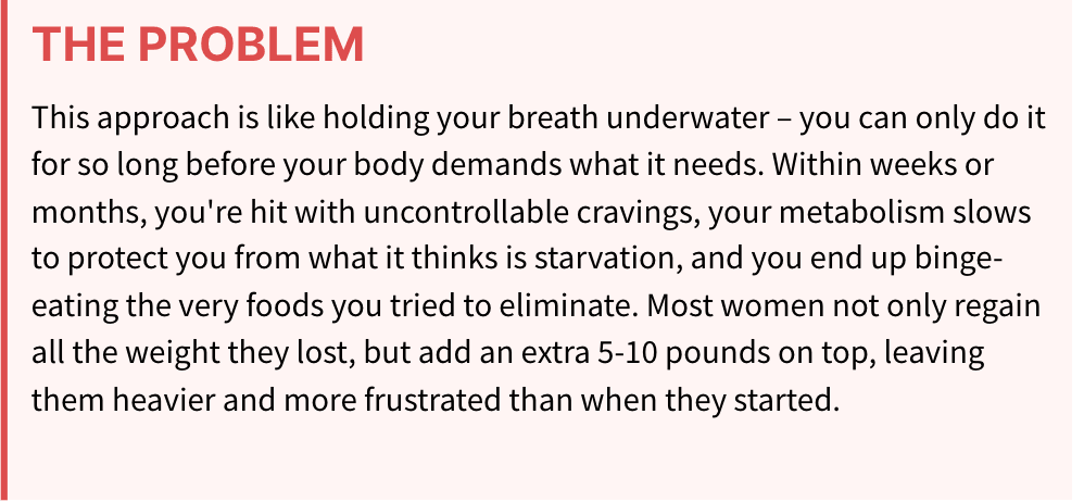 Restriction leads to rebound. The more you restrict, the more your body fights back. It's biology, not a character flaw. Your body is designed to protect you from what it perceives as starvation.